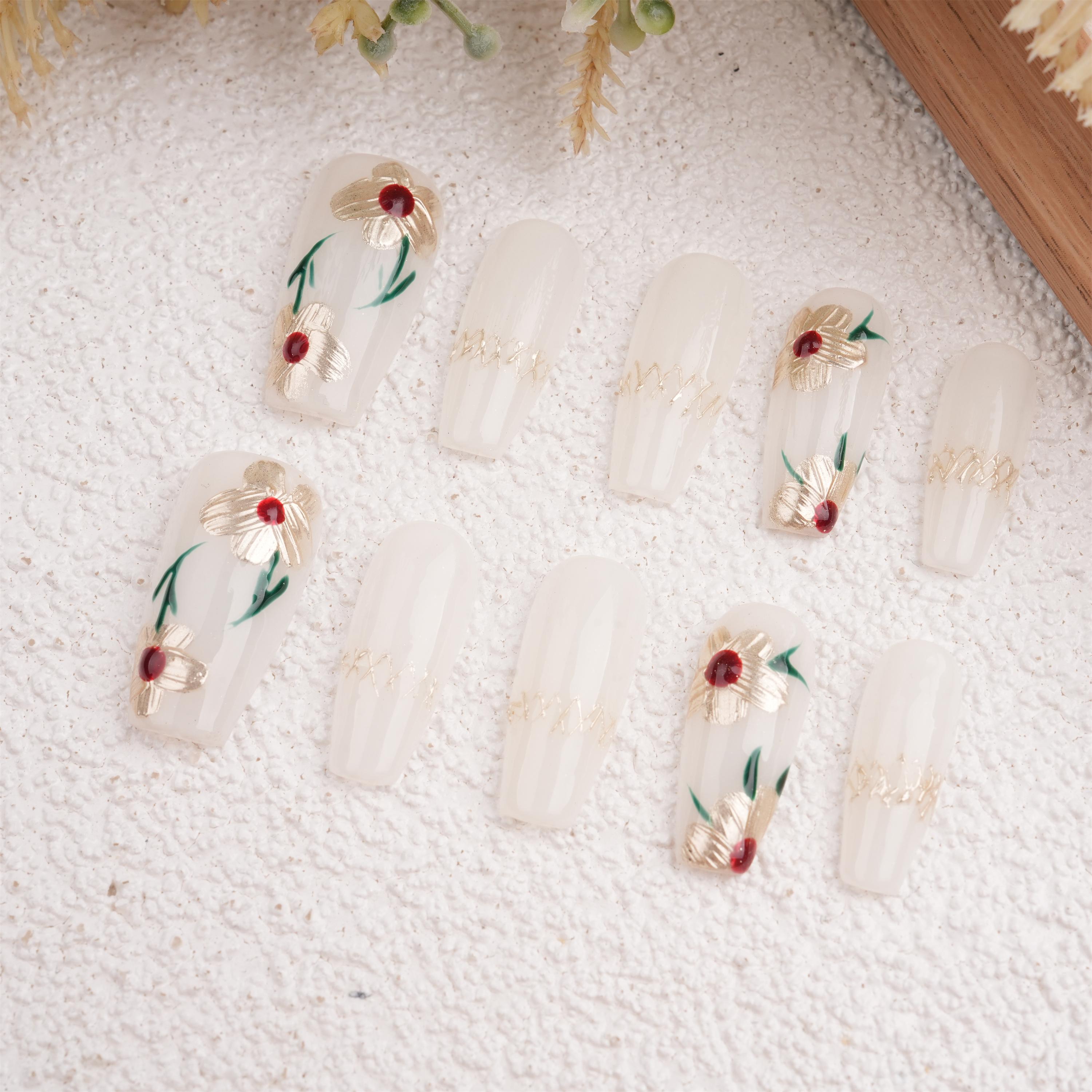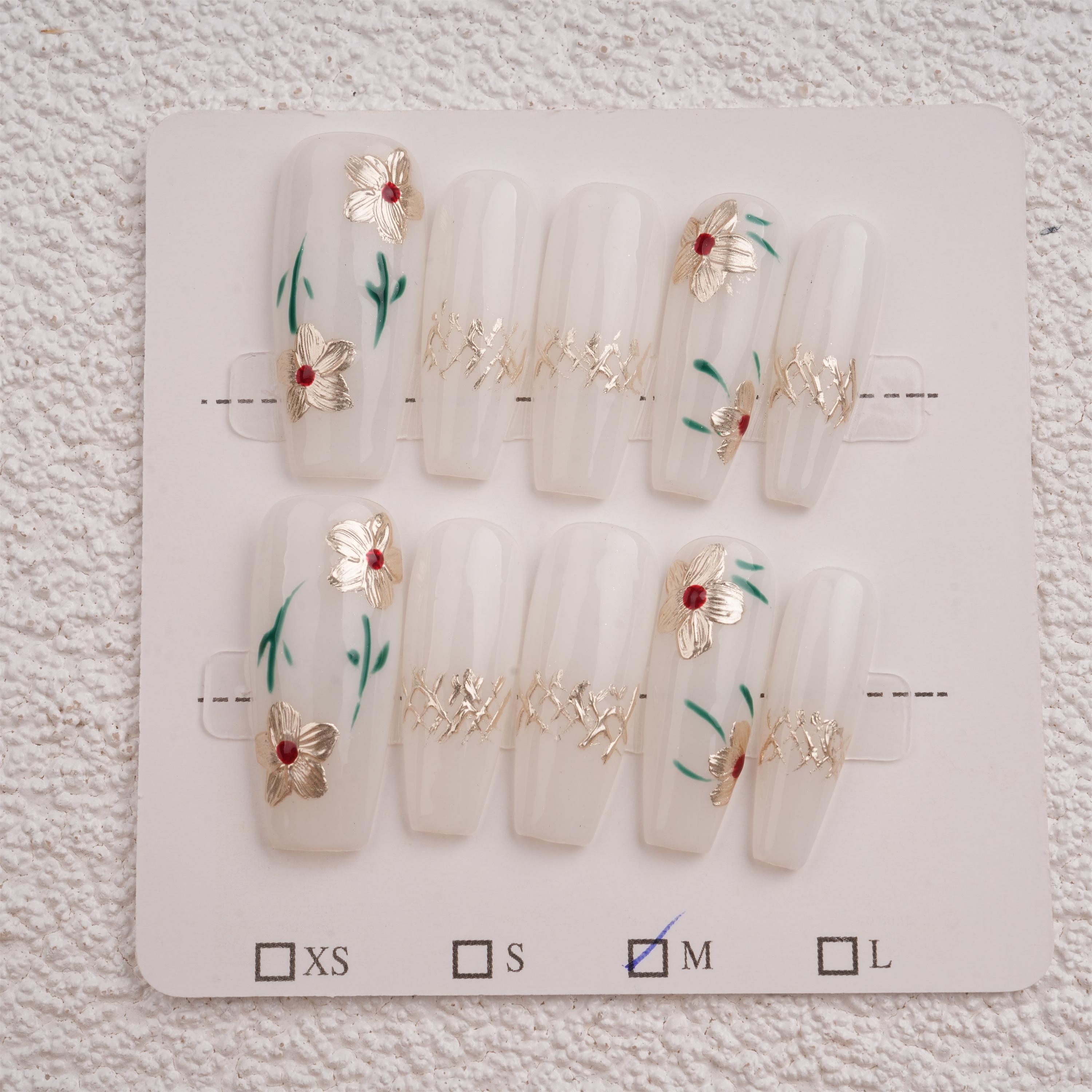 Gold Flowers Almond Fake Nails,10pcs Hand Painted, Jewelry Manicure with Fancy Design